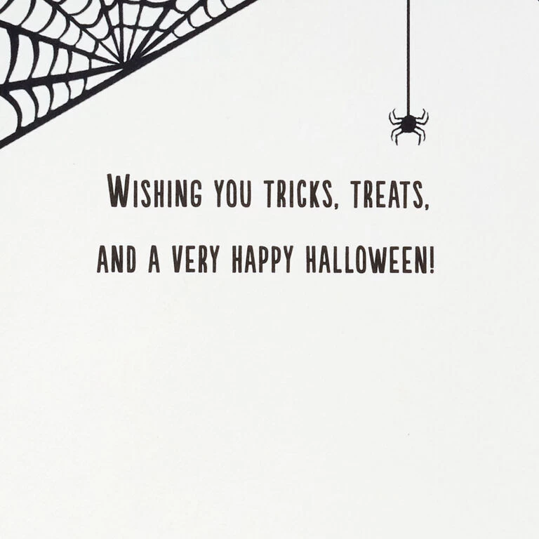 Pop-up Halloween greeting card features a creepy scene of a spiderweb-covered graveyard and pumpkins with a light-up backdrop set in a three-dimensional, laser-cut diorama. Musical card plays a spooky song and lights up when button on front is pressed. Delicate die-cut details adorn the sides to extend the shadow box scene and create a fun display from any angle. Simply unfold the card to create a peek-through shadow box display—no assembly required. When open for display, 3D pop-up card measures approx. 6.25″ H.