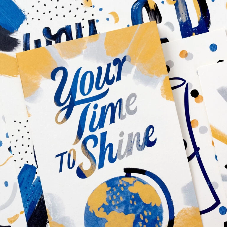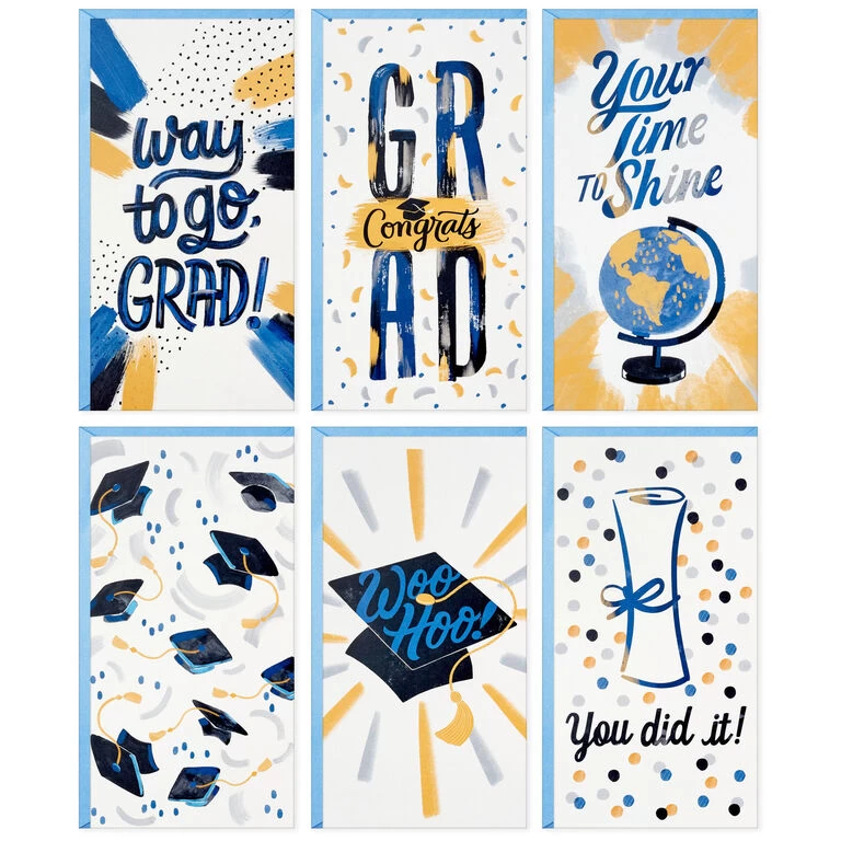Money-holder graduation greeting cards assortment features six cheery brushstroke designs with lettering and icons in blue, tan, gray and white. This multipack of grad cards gives you lots of options for sharing congratulations and best wishes with all the graduates in your life. Each card includes die-cut slots to hold money or a gift card.