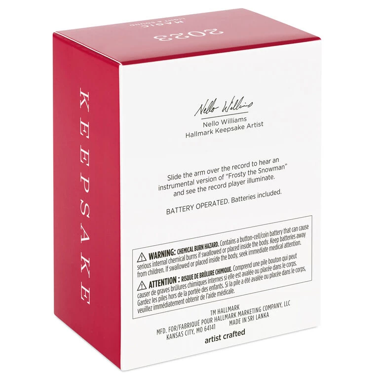 - Key Features: Slide the arm of the record player on this Magic Light and Sound ornament to hear an instrumental version of “Frosty the Snowman” and see the record player illuminate.