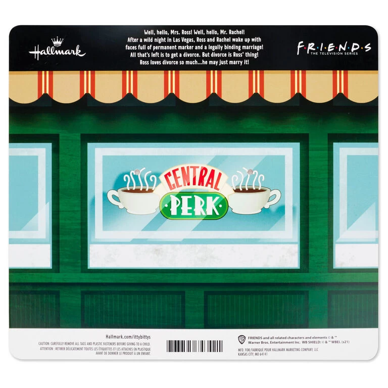 Relive all the hilarious moments from the iconic “Friends” television episode, “The One in Vegas,” when you add this set of two itty bittys to your collection. Stylized plush versions of Ross and Rachel feature the on-again-off-again couple with permanent marker face drawings when they got married in Las Vegas. Makes the perfect gift for pals who love the popular sitcom.